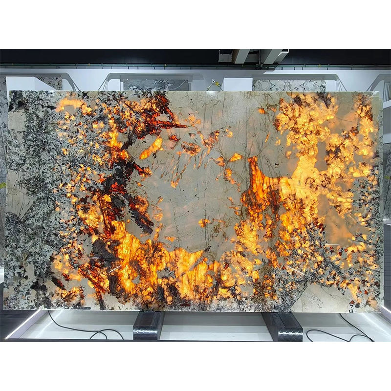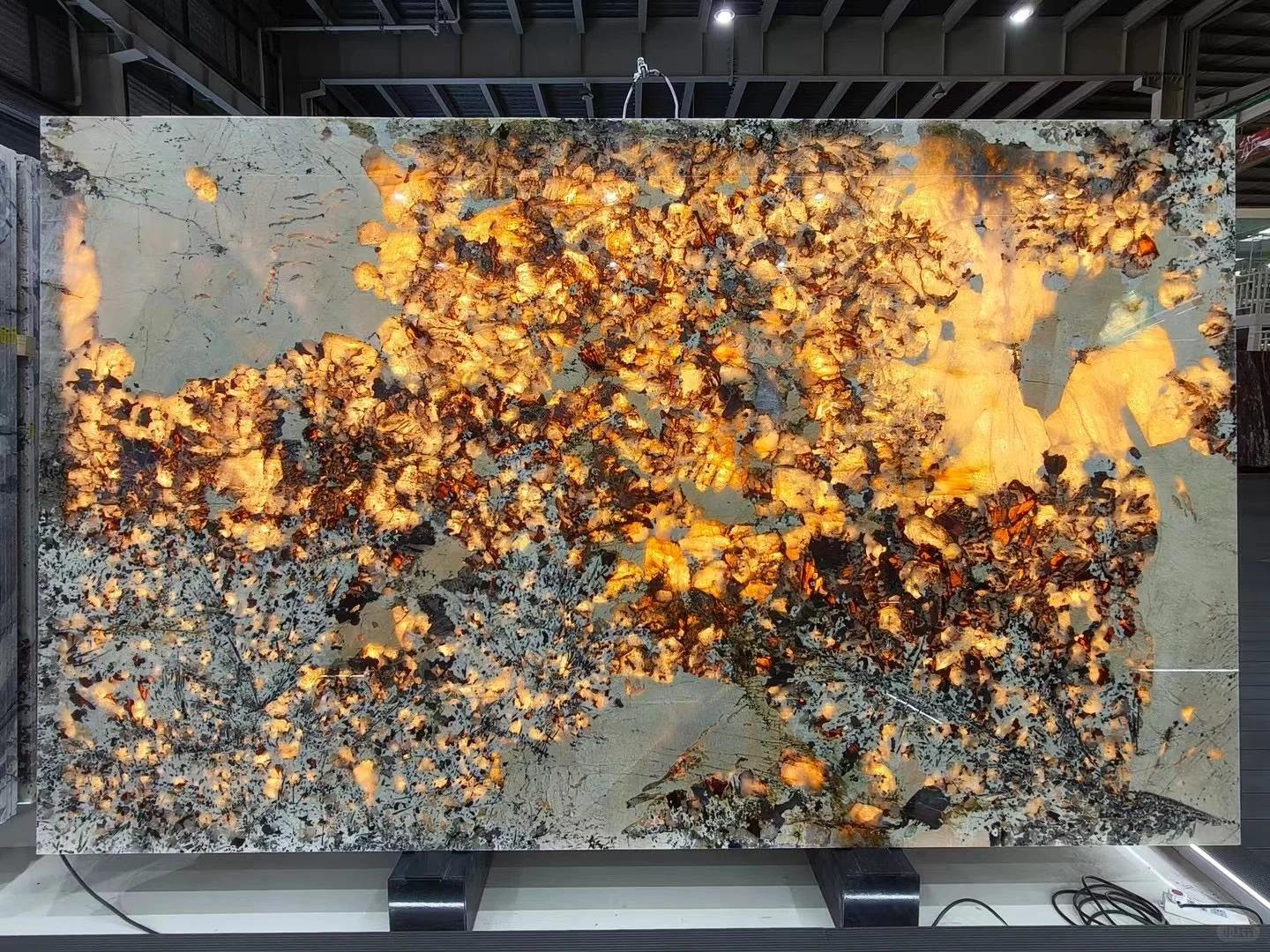 Our Backlit Golden Translucent Granite Slabs are a masterpiece of natural stone innovation, blending raw geological beauty with modern backlighting technology. Each slab features a striking matrix of golden-orange crystalline veins set against a cool, muted grey background. When paired with LED backlighting, the stone emits a warm, ethereal glow that transforms surfaces into captivating focal points. This luxury stone is designed for discerning homeowners, interior designers, and architects seeking to infuse opulence and ambiance into residential or commercial spaces.